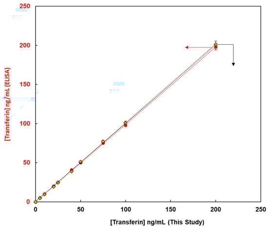 This method, constructed from the magnetic bead-based assay for the detection of glycoproteins, was compared with enzyme-linked immunosorbent assay (ELISA) methods from the viewpoint of quantitative analysis of glycoproteins. Fluorescent magnetic beads were modified using lens culinaris agglutinin (LCA) lectin via avidin-biotin bonding for the detection of human transferrin (FMB-LCA), whereas commercially available ELISA kits were used for the detection of human transferrin. Using these analytical methods, the unknown concentrations of human transferrin samples were detected, and the observed concentrations from calibration graphs were compared. Figure 6 depicts the transferrin concentrations using this paper’s method on the X-axis and those via ELISA on the Y-axis. Thus, a good linear relationship was observed, and glycoproteins were successfully evaluated. Moreover, the limit of detection for this paper’s method was 0.1 ng/mL, whereas that for ELISA was 4.6 ng/mL. Glycoprotein analysis in this study proved more sensitive than the conventional ELISA method, and it is a qualitative, quantitative analytical method that can be widely used as a high-throughput method for the measurement of glycoprotein levels in human biofluids.