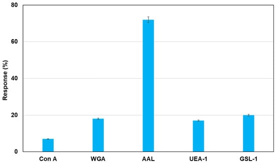 The glycome, which is the repertoire of glycans, such as oligosaccharides, glycolipids, and glycoproteins, produced by individual biological systems such as cells, tissues, and organisms, has been widely studied to modulate numerous physiological and pathological states [1,2]. Glycosylation is an important posttranslational modification of proteins that profoundly affects various chemical and biological processes such as apoptosis, angiogenesis, and microbial recognition [3,4,5]. Glycosylation on cell surfaces is essential for biological processes, which include growth and adhesion of living cells, immune responses, and the maintenance of diverse living systems. Several studies have indicated that disorders in biological processes contribute to several diseases such as diabetes and cancers [6,7,8,9,10,11]. Moreover, cancer-related structural modifications of glycans, such as sialylation, fucosylation, and polylactosamine elongation, are caused due to cellular perniciousness transformation [12,13,14,15]. Presently, mining of the glycome for cancer-associated biomarkers represents a new paradigm for cancer diagnosis and prognosis, and the detection of glycoconjugates as biomarkers of biological events is not only important for the advancement of basic scientific research but also for diagnostic applications. Additionally, model systems such as self-assembled monolayers and gold glyconanoparticles have been widely used to study carbohydrate-protein binding events [16,17,18]. However, the detection limits of previous assays are poor, and more sensitive analytical systems are needed for the detection of carbohydrate-protein interactions due to the inherent diversity, complexity, and heterogeneity of glycan structures that make glycome analysis particularly challenging.