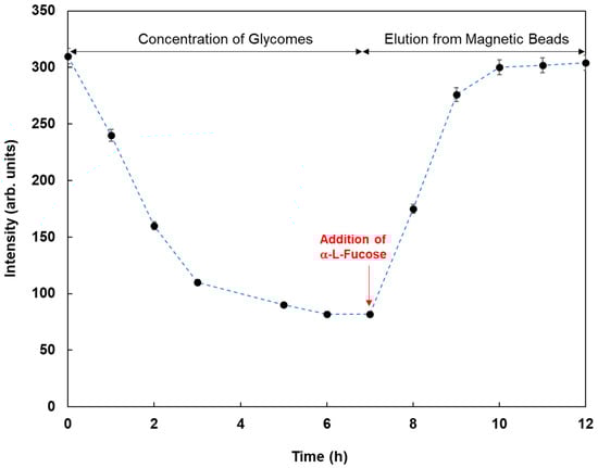 As an application of this method using real samples, cell lysates originating from MCF-7 were profiled. Fluorescent magnetic beads were modified using Con A, WGA, AAL, UEA-1, and GSL-1, and they were reacted with cell lysates from MCF-7, which were monitored using fluorescence spectrometry. Figure 7 shows the fluorescence responses by the reaction of various fluorescent magnetic beads with cell lysates from MCF-7. FMB-AAL showed a strong response, which was consistent with the presence of a higher number of fucosylated O-linked sugar chains in MCF-7 cells than in other cells [26]. Moreover, the reactions between FMB-AAL, which indicated the strongest responses, and cell lysates from MCF-7 were monitored before and after addition of α-L-fucose as inhibitor sugar, and the results are shown in Figure 8. The emission intensities after the addition of cell lysates decreased with time due to the interactions between lectins on the surface of magnetic beads and glycomes in cell lysates. The addition of inhibitor sugars caused the recovery of fluorescence emissions due to the release of glycomes from lectins on the surface of fluorescent magnetic beads. As a result, this method could successfully profile cell lines based on the characteristic difference in the sugar components, and information on the amount of glycome in human cells was obtained using this method.