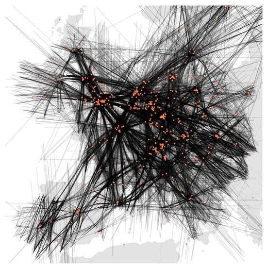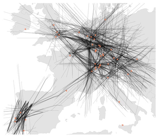 Figure 1. The major European hubs such as London Heathrow, Frankfurt International and Paris Charles De Gaulle are clearly visible since most trajectories converge towards them. The sensor density in LocaRDS is higher around major airports. This is highly beneficial for localization research since, due to the line-of-sight limitation of 1090 MHz communications and the Earth’s curvature, ranges at lower altitudes are shorter. Hence, higher sensor density is required close to airports where arriving and departing traffic is moving at low altitudes. Since these trajectories are more dynamic than en route traffic (which is mostly flying straight lines), low-altitude traffic might be of special interest to some researchers.