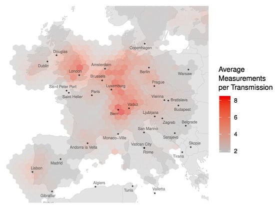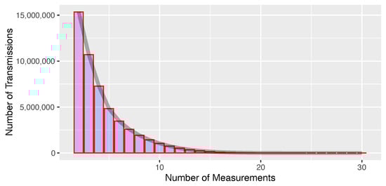 Figure 3, the number of measurements per transmission follows a geometric distribution with a maximum of 30 sensors receiving the same transmission. The geographic distribution of coverage redundancy is shown in