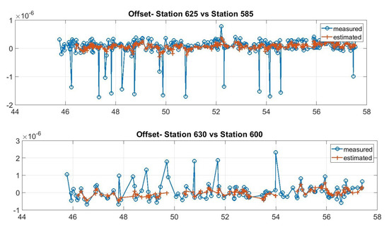 31]. In particular, when the innovation (i.e., the difference between expected and incoming measurements) is larger than a given threshold, the incoming measurement is not used and the offset is extrapolated by the previous state. If the threshold is exceeded several consecutive times, the tracking algorithm is re-initialized, i.e., the track is dropped and a new one is created exploiting the incoming measurements that do not match with the previous track. Examples of the offset tracking performance (in the case of measurements outliers and errors) are shown in