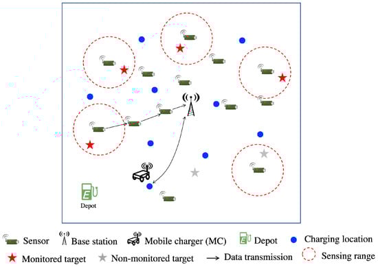 Figure 1 shows the considered network model, in which a WRSN monitors several targets. The network has three main components: an MC, sensor nodes, and a base station. The MC is a robot that can move and carry a wireless power charger. The sensor nodes can receive charged energy from the MC via a wireless medium. The base station is static and responsible for gathering sensing information. We assume that there are n sensors () and m targets (). We call a sensor a target-covering sensor if it covers at least one target. Moreover, if there exists an alive routing path between a sensor and the base station, it is connected to the base station. The target is defined as to be monitored when at least one sensor connected to the base station covers it.
