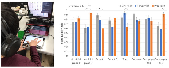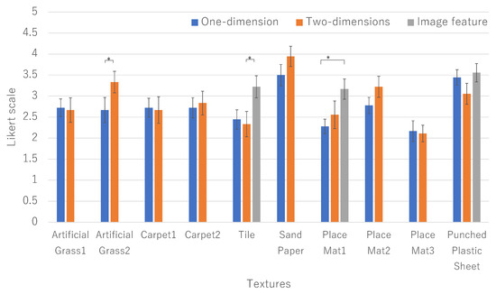 The results of experiments conducted using the eight types of textures are shown below. Figure 3 shows the results of comparing the reproducibility of each method for each texture. Tukey’s test was used for the analysis, and * in the figure shows a significant result at in Tukey’s test.