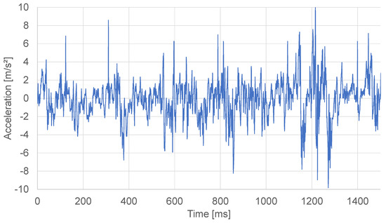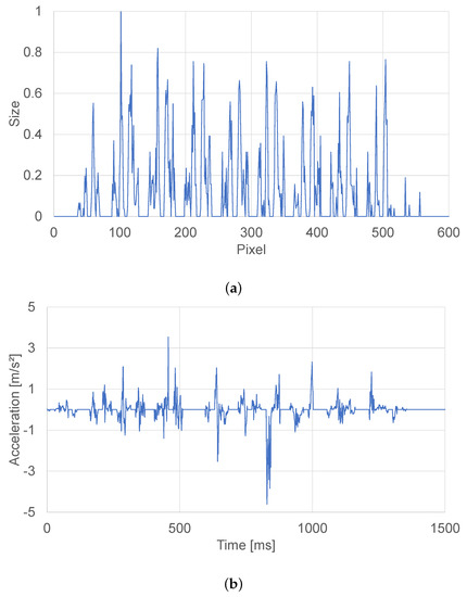 We recorded the rubbing acceleration two times per one texture. One is to record x-axis movement. The other is y-axis movement. Each record has an acceleration -axis, i.e., we have four elements of time series record for each texture (Equation (1)). The information to be recorded is defined as follows. The subscript, r, represents the state of the record, and the subscript, e.g., , represents acceleration direction (x) and finger’s movement direction (y). Thus, is a recorded acceleration of x-direction during a finger movement toward y-direction.