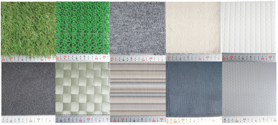 We used ten textures for an experiment. The textures are the following; soft artificial grass1, which is close to natural grass, artificial grass2, which is harder than natural grass, stiff carpet1, soft carpet2, self-made tiled texture, #40 coarse sandpaper, three types of placemats with different feels, and punched plastic plates. Figure 7 shows the image of the texture used in the experiment. From the previous experiment, we found that the periodic features affect the result, though, the previous dataset has only one texture that has periodic features. Thus, we appended the other textures. Furthermore, to evaluate the combined use of the proposed method more precisely, we also appended the other textures.