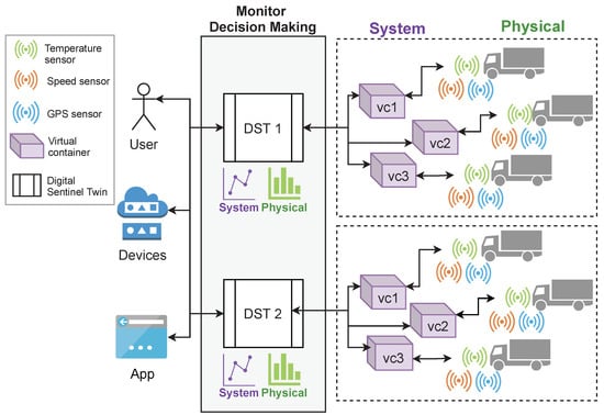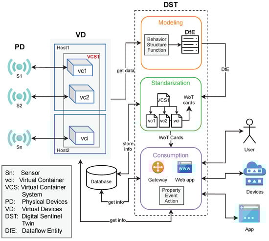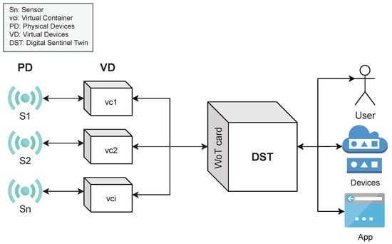 In this paper, we present the design, implementation, and evaluation of a cloud-based WoT method for creating digital sentinel twins () of IoT devices. A DST creates an abstract window for decision-making processes to attain information and data, such as properties, events, and data produced by sensors, and to invoke actions or tasks from IoT devices. An IoT device is a physical device () with sensors and tasks that can be accessed directly or through a virtual device (). A is an application or microservice encapsulated into a virtual container for acquiring, extracting, processing, monitoring, and analyzing data from PDs. Figure 1 shows an example of the process used by a DST to create a window for decision-making processes consumption (by either a human, application, or VD). As it can be seen, in this approach, the applications or services used in decision-making processes deal with DSTs instead of managing the complex details associated with the PDs, VDs, or cloud computing infrastructures.