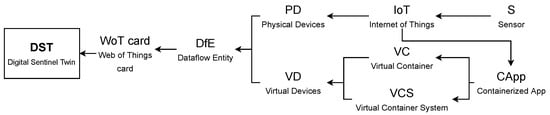 We propose to create digital twins of the IoT data acquirers (hardware, physical machine, or virtual container, application, or microservice) by using Web of Things cards (WoT) (www.w3.org/WoT accessed on 5 August 2021) for decision-making process to retrieve, in real time, data and information or invoke actions or tasks. A digital twin is an abstract representation commonly used in Industry 4.0 for IoT device monitoring [18]; that is, a virtual replica of objects or processes that simulate the behavior of their real counterparts. WoT is an initiative for representing and managing definitions of IoT artifacts (devices, components, applications, etc.), which suggests using a set of well-accepted protocols from the Semantic Web for any IoT artifact from the physical world to be available into the World Wide Web by creating a net of WoT definitions [19].