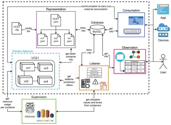 The behavior of the is established by assigning values to its properties, that is, by associating the function of the with the infrastructure (H) defined in the configuration file. The are deployed on , being I the whole infrastructure (e.g., a cloud). The consumption of a set of resources (R) of the specified infrastructure (processor—CPU, memory—MEM, file system—FS, and network—NET) is denoted as per each , which are observed by a set of metrics (M).