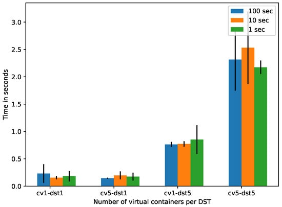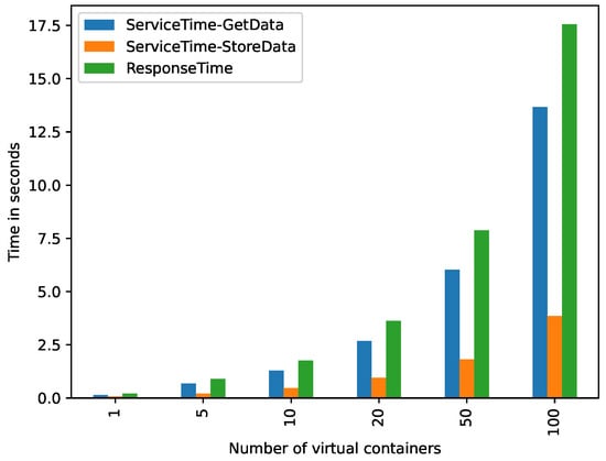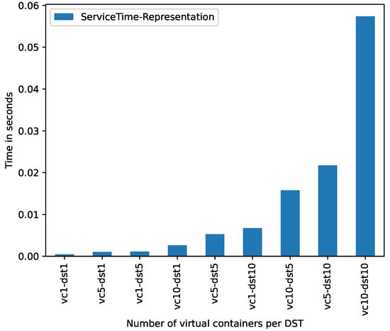 Figure 7 shows, in vertical axis, the spent by the to retrieve information about and to the end-user (in this case a client application) per different sequences of and virtual containers (horizontal axis) for different time . It can be observed that increasing the number of s per also increases the number of requests performed by the per slot, increasing . The obtained is acceptable as soft real time [40].