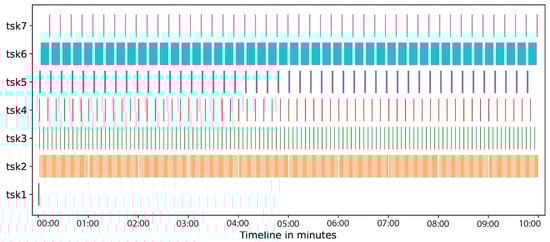 Figure 9 shows, in the horizontal axis, a timeline of the tasks performed by participants on the dataflow (vertical axis) of verifying contract violations: Build (tsk1), data acquisition of temperature (tsk2), data acquisition of speed (tsk3), data acquisiton of GPS (tsk4), send request (tsk5), get data (tsk6), and deliver request (tsk7). The timeline for this case study was 10 min. In tsk1 the prototype builds two . Then, the data acquisition was carried out from IoT sensors (tsk2, tsk3, and tsk4) by the virtual containers, which were stored on the blockchain network. Additionally during the timeline, every 10 s, the virtual containers verified, registered, and reported contract violations on the blockchain network: first the consumer requests to (tsk5), then the blockchain is queried by the corresponding virtual container (tsk6), and finally the responses to the consumer (tsk7). As it can be seen, the impact of the creation (tsk1) and communications (tsk5 and tsk7) is not significant in comparison with the time spent by get data from the blockchain network (tsk6) and the data transfer from sensors to the blockchain network (tsk2, tsk3, and tsk4). Figure 9 also shows that can capture the data produced by both, s (tsk6), and s (tsk2, tsk3, and tsk4).