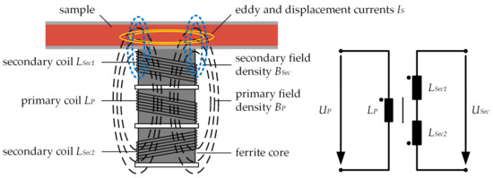 Schematic illustration of a differential transformer for measuring the electromagnetic properties of a sample. The differential transformer consists of three coils located on a ferrite core. The connection of the coils is illustrated in the equivalent circuit of the unloaded differential transformer on the right-hand side.