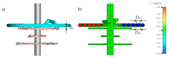 Due to the series connection of all turns, the current distribution is approximately constant in all turns, as shown in Figure 10. The color gradient represents the x-component of the current density JS,x. By comparing the relative change in impedance reciprocal ZS−1 of the helix in Figure 10 for ξ1 (black dots) with that of the radial spiral in Figure 6 (black dots), it can be noticed that the impedance increase is less in the case of longitudinal winding. This is to be expected, since ZS is proportional to the length and the length increases less with each turn for the longitudinal case than in the radial case. The reciprocal of the impedance ZS in Figure 9 was normalized to ZS−1(nL = 1) in order to obtain the relative change. By taking a closer look at Equation (14), it can be noted that ZS−1 decreases approximately proportional to nL−1. However, due to the decreasing primary field density BP in increasing z-direction, it cannot be assumed for longitudinal winding that the induced voltage into the tubing increases proportionally to nL. Therefore, the induced current into the tubing also decreases, as can be seen from the simulated current IS in Figure 10 (red dots, κ = 2 S/m). Again, compared to the radial winding, the current IS decreases less with increasing nL. Since IS in Figure 10 is not compared to a calculated relationship as in Figure 6, IS is not normalized and the absolute simulated values are shown.