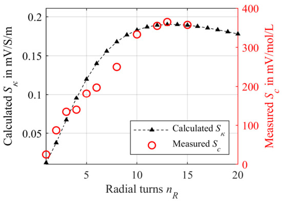 The simulated sensitivity Sκ versus the number of radial turns nR using the CST-EM Studio model from Figure 4 is represented as green dots. Sκ was determined using Equation (3) while the κ was changed from 1 S/m to 2 S/m. The blue squares represent the calculated sensitivity using the mathematical model from Equation (12).