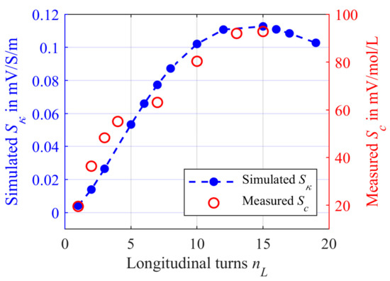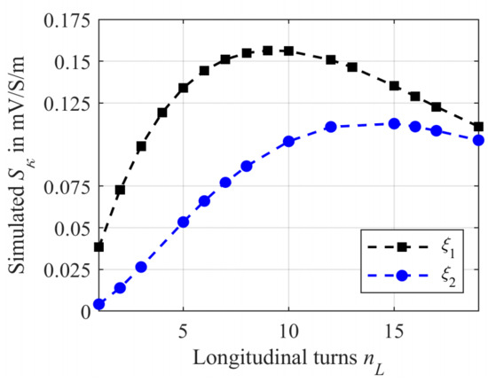 As can be noticed for both cases, initially the sensitivity increases with increasing number of windings and reaches a maximum. The maximum sensitivity Sκ,max for ξ1 is located at nL = 9. Subsequently, the sensitivity decreases again. Furthermore, the maximum sensitivity is about 0.156 mV/S/m. Compared to radial winding with the maximum at nR = 4, the maximum for the shortest longitudinal winding method is at higher values of nL.