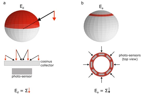 Here, we propose a new approach to integrate radiance: annular irradiance (see Figure 1). Therefore, instead of integrating the light arriving at the full upper semi-sphere, we propose integrating only the light that arrives at a specific ring of the light sphere. The choice of the annular angle in which the ring of sensors is set will determine the quantity of light arriving at the sensor and the shadow affecting the measurements. This new approach aims to (i) simplify the instrumentation design: instruments may be designed with a “tubular” shape. This makes them much easier to assemble, deploy, manipulate, and maintain. This simplicity makes -based instruments ideal candidates to be used in citizen science-based water quality monitoring. (ii) Avoid self-shading: Sensors at a particular depth do not interfere with the rest of the sensors at different depths (this happens with based instruments). With this mechanism, the device works as a moored system, covering the spatial and temporal resolution of the water column. (iii) Provide very high vertical resolution measurements: As there are no potential self-shading effects, installing a large number of sensor units at different depths could be possible. This could be potentially useful for those observations that require concurrent high vertical resolution measurements.