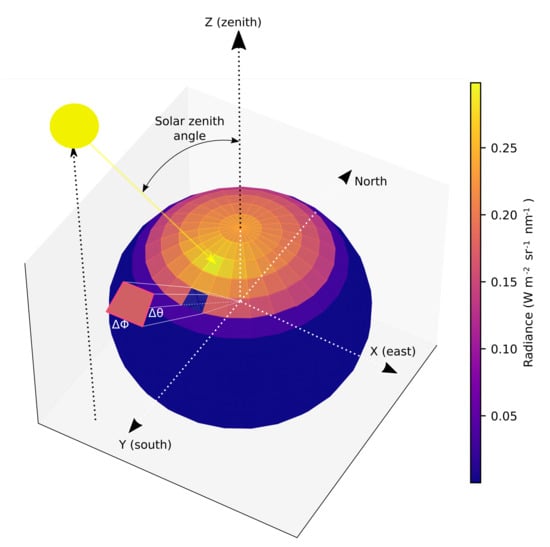 with being the amount of radiant energy incident in a time interval centered on time t, onto a surface of area located at position (), and arriving through a set of directions contained in a solid angle on the direction () normal to the area , as produced by photons in a wavelength interval centered on wavelength []. The units of radiance are W m nm sr. One of the most commonly measured radiometric quantities is irradiance. The irradiance E, or flux density of radiant energy, is the integrated radiance on a unit area and is usually expressed as W m. The spectral downward plane irradiance is related to the spectral radiance, which measures photons traveling in all downward directions, but with each photon’s contribution weighted by the cosine of the photon’s incident angle [].