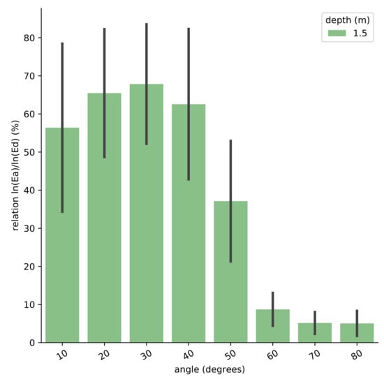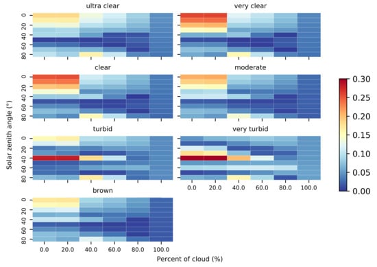 Finally, we analyze the relative error of as a function of the different types of water. Figure 7 shows that the estimated error of computed from at 1.5 m depth has variations depending on which water type is analyzed. Clear waters have larger errors when the solar zenith angle is close to the zenith; however, turbid waters have errors focused on solar zenith angles close to the incident angle of .