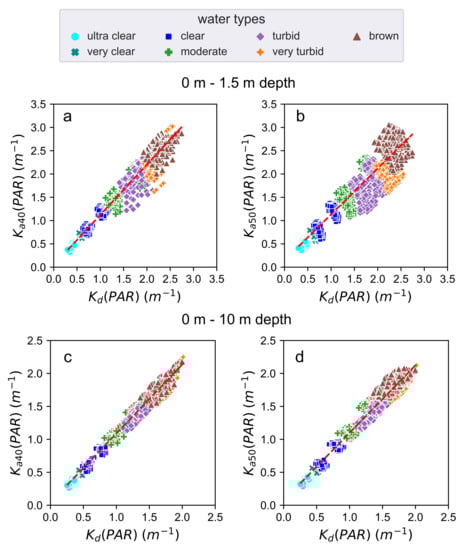 (a) Scatter plot between the and computed in a range depth between 0 m and 1.5 m depth. (b) Scatter plot between the and computed in a range depth between 0 m and 1.5 m depth. (c) Scatter plot between the and computed in a range depth between 0 m and 10 m depth. (d) Scatter plot between the and computed in a range depth between 0 m and at 10 m depth. All plots are configured in the PAR region, with solar zenith angle between and , and cloud coverage between 0% and 100%.