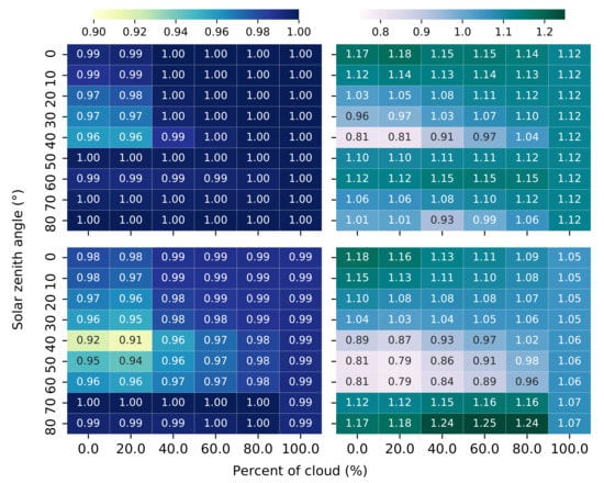 The regression line’s slope between and presents variability in the range from solar zenith angles at and cloud coverage at 0–, with values equal to 0.81, to solar zenith angles at and cloud coverage at 0–, with values equal to 1.18. For the rest of the lighting scenarios the regression line’s slope remains stable in values close to 1.1. The regression line’s slope between and presents variability in the range from solar zenith angles at – and cloud coverage at 0–, with values equal to 0.79, to solar zenith angle at and cloud coverage at 40–, with values equal to 1.25. The rest of lighting scenarios the regression line’s slope remains stable in values close to 1.05–1.12.