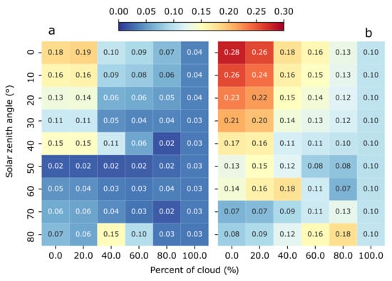Figure 6 shows the relative error between and (left) and between and (right) as a function of the solar zenith angle and cloud coverage at 1.5 m depth. By using the Equation (11) and the values of the linear regression from Table 4, we estimate the values of from and , and we provide an estimation of the relative error by following Equation (10). In the case of the estimated from , for solar zenith angles from to , and cloud coverage from to , it has a relative error in the range of to . In the other lighting scenarios, the relative error decreases to lower values until almost . In the case of , the estimation of has relative errors higher than at solar zenith angles from to , and cloud coverage from to . In the rest of the lighting scenarios, the relative error is constant at approximately. We have focused our analysis in 1.5 m depth, but as shown in Table 4 and Table 5 similar results are obtained when we consider different depths.