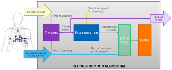 As previously mentioned, to obtain the Standard 12-Lead System ECG, theoretically, at least three ECG leads are required [11]. This minimum use case of three leads is used in this work. Reconstruction was carried out as described in Figure 2. The reconstruction algorithm model was trained for a time that was empirically determined, and the rest of the record was processed with the obtained model. The goodness of the reconstruction was evaluated comparing the estimated signal with the actual one recorded at the standard leads position using the five Figures of Merit (FoM) that will be defined in Section 2.3.