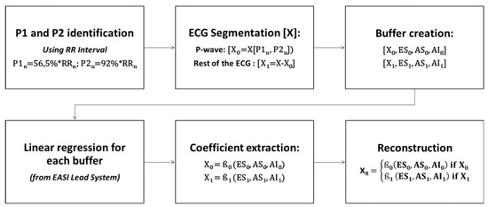 These coefficients can be applied to the entire signal, although the different waves that constitute the ECG can also be taken into account to select different coefficients, as suggested in past studies [18]. A common approach is to use two sets of coefficients, one for the reconstruction of most of the ECG and the other for the reconstruction of the much lower energy and highly clinically relevant P wave [9], as it is the reference for some pathology diagnostics, such as left ventricular interstitial fibrosis [19].