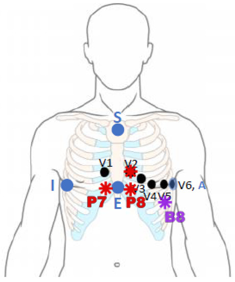 Additional electrodes location. In blue dots, the Dower location, and in red and purple, our proposed location. Red dots (, and ) are located in the patient’s chest, and the purple one () is placed in the back. In black, the standard precordial leads are shown for reference.