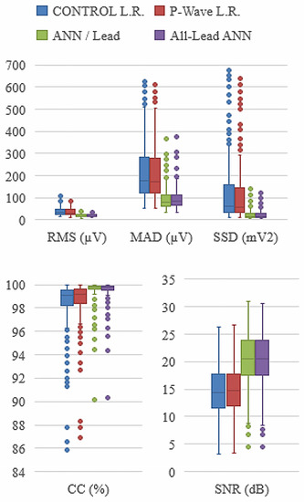 The results have been expressed in terms of median and interquartile ranges represented in the form of boxplots in Figure 7. The results for both Linear Regression methods are represented in blue and red for the simple Linear Regression method and the P-wave segmentation method, respectively. The ANN strategies are represented in green and purple for the ANN/lead and the unique ANN methods, respectively. Independence of each group of results has been studied for each FoM between the control method (simple Linear Regression) and the other three proposed reconstruction methods, as shown in Table 1. The differences of all the FoMs in both methods involving ANN with respect to the control are highly significant. On the contrary, the P wave segmentation method does not show significant differences for any of the five FoMs. No significant difference was found between the two ANN-based algorithms by means of the Wilcoxon test. Figure 7 shows the FoMs for each method to reconstruct the Standard 12-Lead System from the three leads of the Dower location.