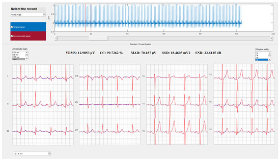 Cross Correlation, CC, expressed as a percentage % is defined by Equation (5), where and are the global averages of the original and reconstructed signals, respectively, and and are the standard deviations of the original and reconstructed signals, respectively, in addition to the variables defined above. As mentioned before, many authors use this method, so the new results can be easily compared with theirs [34,35]. Nevertheless, the CC is not an accurate estimator of the reconstruction goodness, because it rests most of its value in the fitting of the isoelectric line and, in any case, to the high energy QRS complex. The rest of the ECG wave morphology does not substantially affect this parameter, which may be critical to the diagnosis of certain pathologies.
