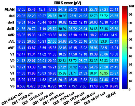 Root Mean Square Error, RMS or , is mathematically described by Equation (4), where is the original signal, is the reconstructed signal, and n is the index of each sample of the signal of length N. has the advantage that it keeps the original units of measure, millivolts (), although here it has been converted to microvolts () to facilitate its understanding in future graphic representations [34].