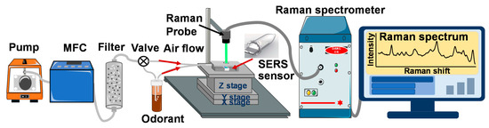 Surface-Enhanced Raman Scattering (SERS) is a widely used sensing technique in which the Raman signal of molecules adsorbed onto noble metal surfaces (such as silver or gold) can be greatly enhanced [1,2]. The SERS detection technique has significant potential in clinical diagnosis applications [3,4,5,6], owning to its rapid detection, high sensitivity down to single molecules and non-invasive recognition of disease biomarkers according to its specific Raman signature. In the explosive detection [7,8] and environment monitoring fields [9], the SERS technique could realize ultra-trace, real-time detection and efficient discrimination of detection molecules. The rapid and accurate determination of plant volatile organic compounds by the SERS technique is beneficial for indicating the healthy status of plants [10,11]. The instrumentation used in the rapid SERS detection technique is portable, and SERS sensors are inexpensive to prepare. Therefore, the SERS technique could be utilized for analytical chemistry at the point of sample [12]. Integrating graphene oxide with the SERS sensor can improve the sensitivity of sensors, because graphene oxide/silver composites can generate strong chemical enhancement [13]. Due to the unique vibration frequency of molecules, rich fingerprint information is provided in the Raman spectrum. By processing information from the Raman spectrum, it is possible to effectively accomplish the classification and recognition of samples detected by the SERS sensor [14,15,16]. However, the characteristic peaks of detection samples with similar molecular structures may overlap in the Raman spectra. Therefore, it is necessary to enhance the selectivity of the SERS gas sensor in this detection situation.