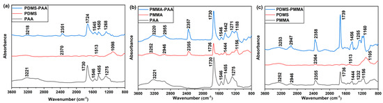 FT-IR spectra in the 800–3600 cm−1 range of the SERS gas sensor coated by (a) PDMS-PAA, (b) PMMA-PAA and (c) PDMS-PMMA polymer film.