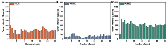 Raman intensity collected from the random 30 points obtained using the (a) PAA, (b) PMMA and (c) PDMS polymer film-coated SERS gas sensor for phenethyl alcohol gas detection.