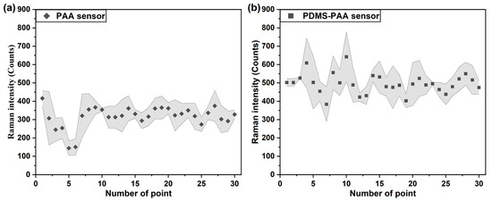 Error band calculated using 30 points obtained from (a) PAA-coated and (b) PDMS-PAA-coated SERS gas sensor for phenyl ethanol gas detection.
