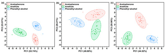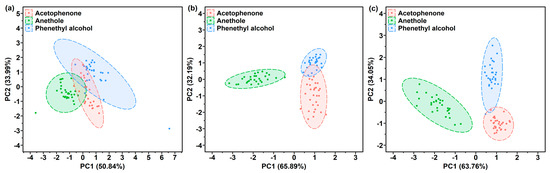 PCA score plots by (a) PAA-coated, (b) PMMA-coated or (c) PDMS-coated SERS gas sensor used for the gas detection of phenethyl alcohol, acetophenone and anethole.