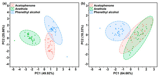 Comparison of PCA score plots of the (a) PDMS-coated and PAA-coated SERS gas sensors combination, and (b) one PDMS-PAA-coated SERS gas sensor used for the gas detection of phenethyl alcohol, acetophenone and anethole.