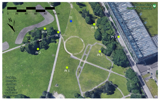The last station was located in difficult measuring conditions for GNSS technology (Figure 12). On the west side the horizon was directly limited by a building, while on the east side by a line of tall trees—the tripod was set up along an alley running between a park and a large football stadium.