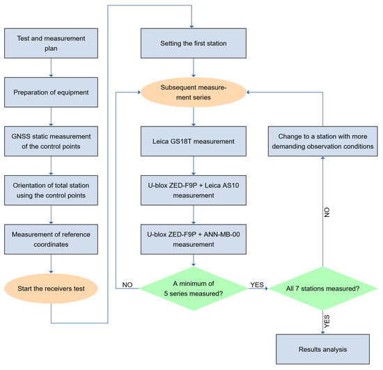 Reference coordinates were determined with a precision of one order of magnitude higher than the one of RTK/RTN measurements. Measurement series were performed alternately to ensure that the satellite configuration was as similar as possible between measurements in successive hardware configurations. The measurement stations were placed in locations with increasingly difficult measurement conditions, as shown in Figure 15 by the increasing coordinate differences and variations in standard deviations. Therefore, it can be concluded that the tests were carried out reliably, as shown in the results above.