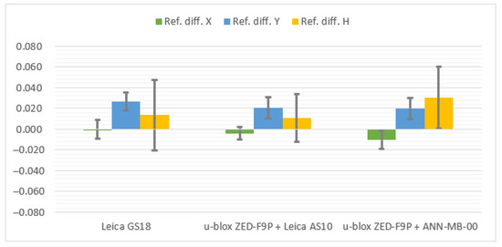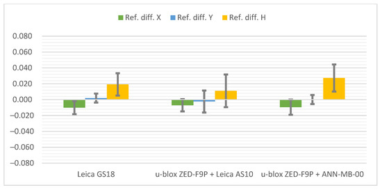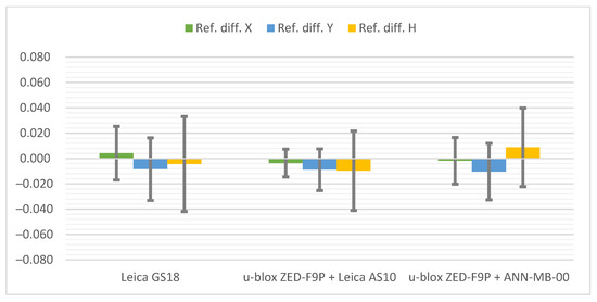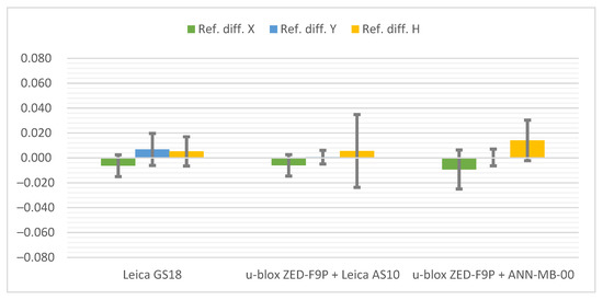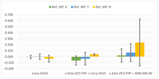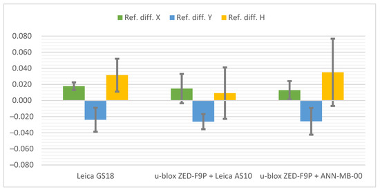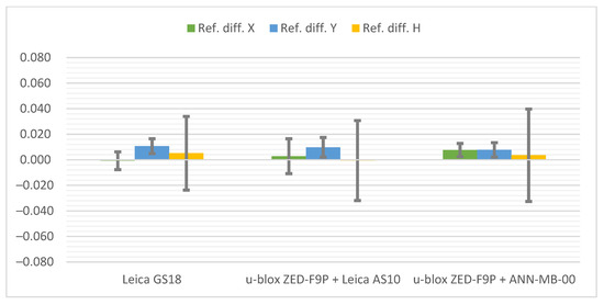 Below (Figure 6) there are cumulative graphs, clearly illustrating the results obtained. There are differences from the reference coordinates with standard deviation bars on it. Both receivers meet the requirements in terms of general RTK Network measurement accuracy. It is worth mentioning that the most convergent coordinates to the reference ones were obtained with the u-blox ZED-F9P + Leica AS10 antenna set. On the other hand, the standard deviations present the slightly higher repeatability of the Leica GS18T. The increase in measurement accuracy in the vertical plane of the ZED-F9P receiver after replacing the antenna with the Leica AS10 can also be seen.