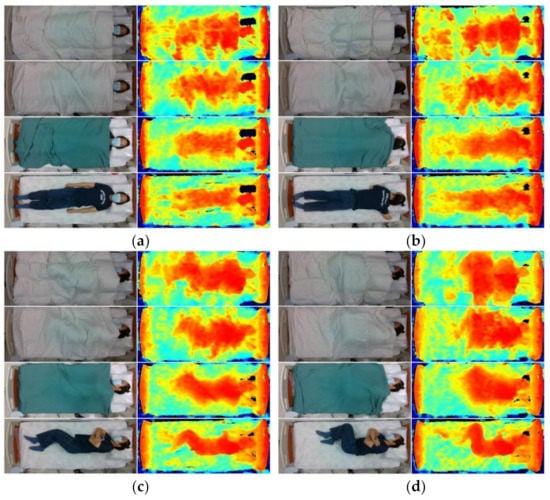 RGB (left column) and infrared (right column) images of typical participant under thick (first row), medium (second row), thin (third row), and control (fourth row) blanket conditions in (a) supine, (b) prone (head left), (c) log (right), and (d) fetal (right) postures.