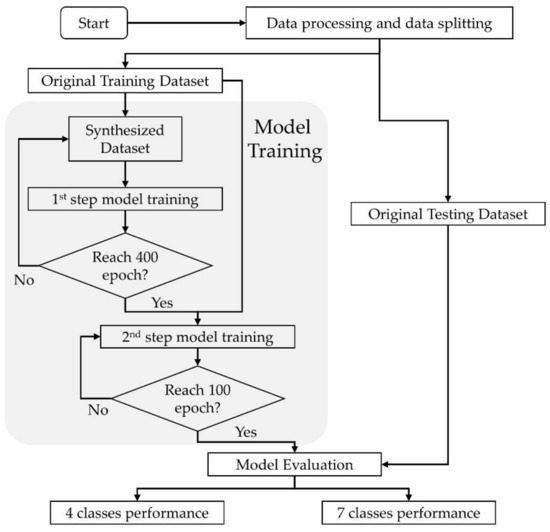 The Adam optimizer was used at a fixed learning rate of 0.0001 and L2 regularization of 0.0005. The model was trained in two steps because of the bias in probability density distribution in the synthesized dataset. The model was firstly trained by the synthesized dataset at 400 epochs and afterward trained by the original training dataset at 100 epochs, determined by the observation of the learning curve.