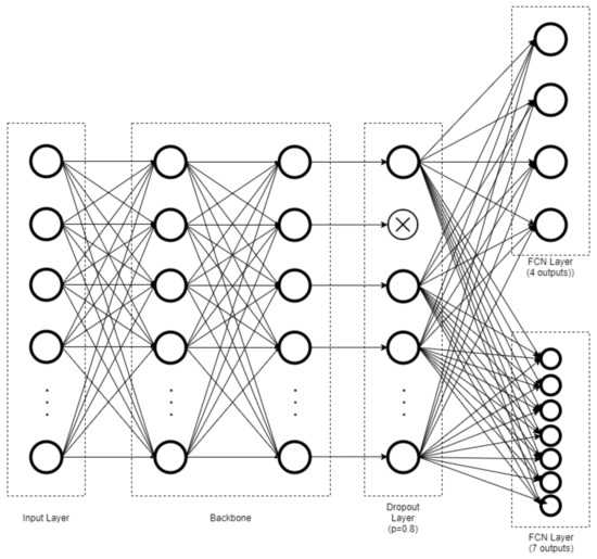 A convolution neural network (CNN) with EfficientNet as the backbone [38] over 2 output channels was implemented via TensorFlow Keras v. 2.4.1 (Google Brain Team, Google Alphabet, Mountain View, CA, USA) with Compute Unified Device Architecture, CUDA (Nvidia, Santa Clara, CA, USA). The CNN was built by replacing the last layer of EfficientNet with a dropout layer, followed by 2 parallel fully connected network (FCN) layers, and Softmax was used as the activation function to achieve coarse-(4-posture) and fine-grained (7-posture) classification. The network was initialized with weights pretrained using the “nosy-student” transfer learning method [39]. The dropout layer was assigned with a probability of 0.8 to overcome the overfitting problem. Figure 3 and Figure 4 show flowcharts of the functional component linkage and the architecture of the model network, respectively. The model was subsequently trained using the prepared dataset for the coarse-(4-posture) and fine-grained (7-posture) classification. The fine-grained classification was based on the 7 postures performed by the participants. In the coarse classification, the log and fetal posture classes were merged into the side-lying class, and the prone postures with different head positions were also pooled.