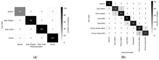 The confusion matrix in Figure 5a shows that the performance in classifying supine and prone was slightly inferior to that of left and right side-lying posture. The confusion matrix in Figure 5b shows that the majority of predicted errors were contributed by the further sub-classification of log and fetal postures and the head facing left and right in prone posture.