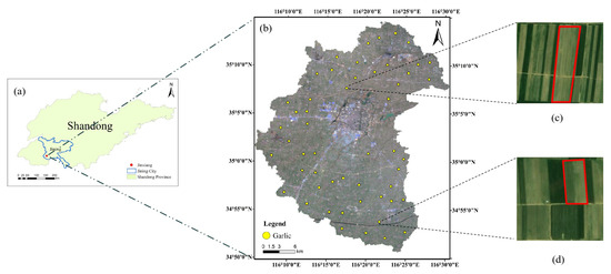 (a) The location of the study area; (b) the spatial distribution of garlic sample data on the satellite image from 9 February 2020 (true-color composite of the blue, green, and red bands of Sentinel-2 image); (c,d) the garlic sample data on the Google Earth satellite images.