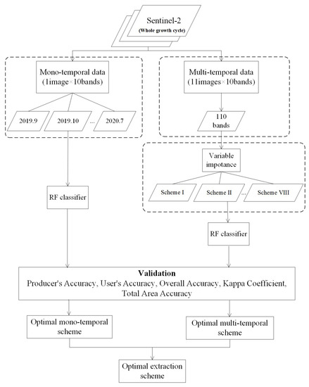 Figure 2 depicts the study workflow. Based on Sentinel-2 images from the entire growth period of garlic, we developed mono-temporal and multi-temporal garlic extraction schemes and the accuracy of the results was evaluated and analyzed.
