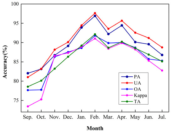 Figure 3 shows five indicators (PA, UA, OA, Kappa, and TA) for garlic extraction by classifying the images of each month and depicts how the accuracy of garlic extraction varies greatly from different months. The accuracy gradually increases with time, and it grows the fastest from October to November. It could be since garlic is in the seedling stage and is tender and green. In contrast, other crops (especially for winter wheat) only have the light-yellow seedlings differ from the spectral characteristics of garlic. The accuracy peaks in February and April and then decreases gradually. In particular, the accuracy in February is the highest (OA = 91.79%, Kappa = 91.04%, and TA = 92.14%); the accuracy in September is the lowest (OA = 82.04%, Kappa = 91.04%, and TA = 78.56%).