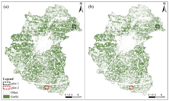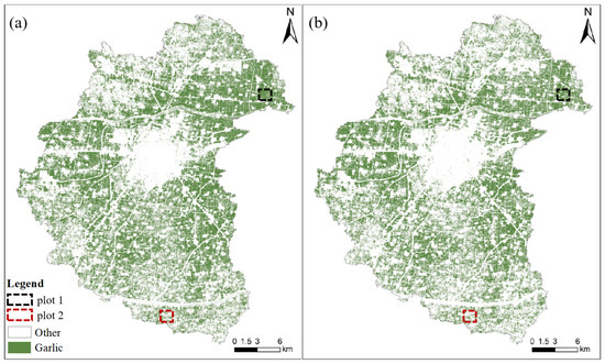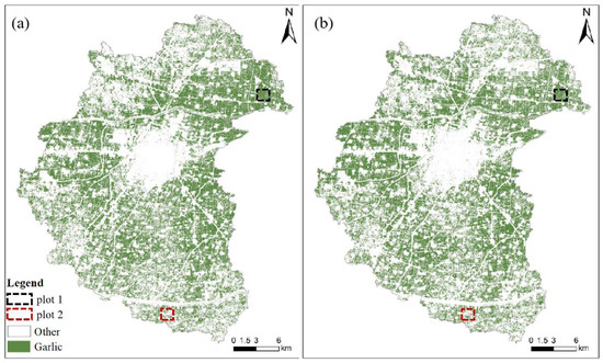 Garlic extraction results of (a) optimal multi-temporal and (b) mono-temporal schemes.