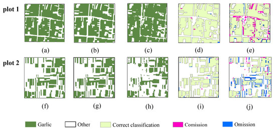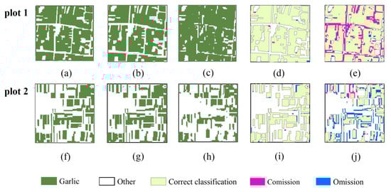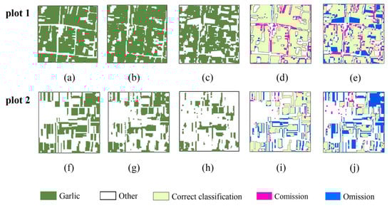 Figure 12 depicts enlarged results of mono-temporal scheme and multi-temporal scheme for plot 1 and plot 2. The garlic planting area extracted using the multi-temporal scheme (Figure 12b,g) is more suitable for actual garlic distribution (Figure 12a,f), and the commission error is less than 1%, and the omission error is less than 3%. It can be seen that the effect of garlic extraction in the mono-temporal scheme is worse, commission error of plot 1 is 8.33%, while omission error of plot 2 is 23.34%. As a result, the multi-temporal scheme is the most effective for garlic extraction.