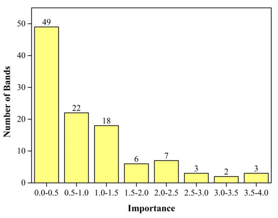 In order to evaluate the importance of different bands, we divided the importance scores by taking into account the running time and work efficiency. In this study, we used 0.5 as the step length and divided 110 bands into eight groups. The number of bands for each score segment is depicted in Figure 6. It shows that the number of importance scores in the range of 0.0–0.5 is the greatest, with 49. The score is then in the range of 0.5–1.0, with a total of 22 bands. Thus, the scores are 2.5–3.0, 3.0–3.5, and 3.5–4.0, with three bands, two bands, and three bands, respectively.